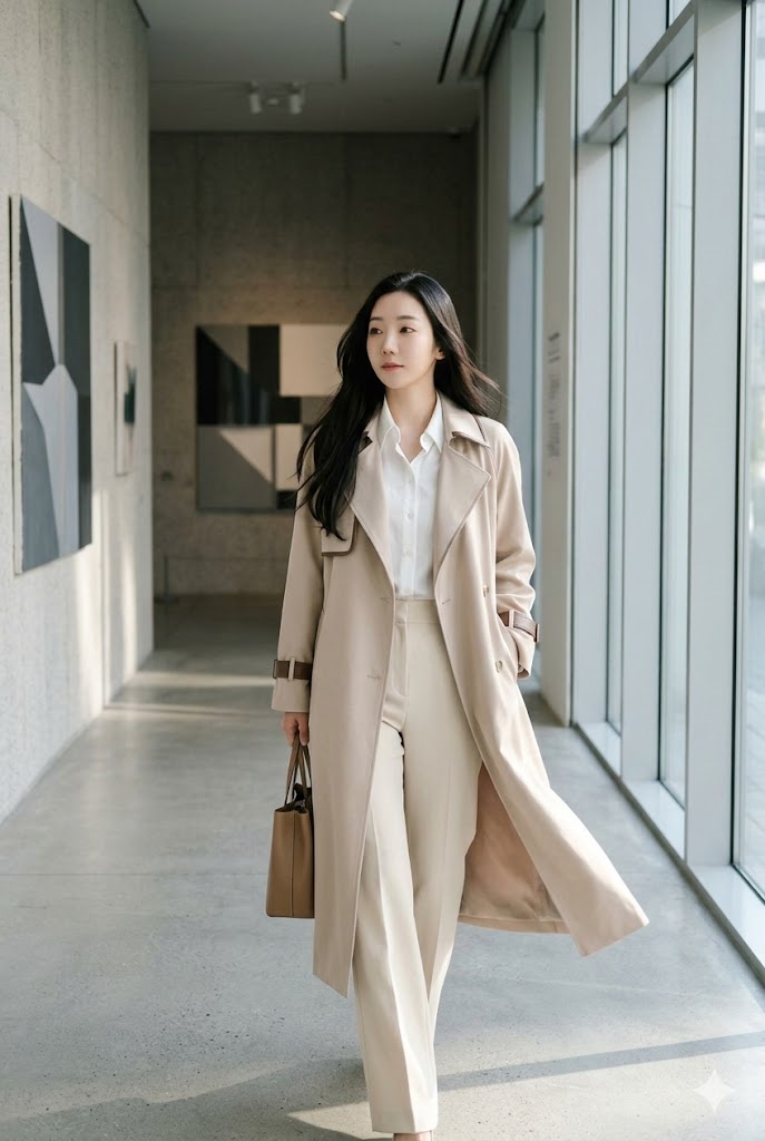 - 코디: 뉴트럴 톤의 롱 트렌치 안에 화이트 셔츠와 와이드 슬랙스를 매치해.