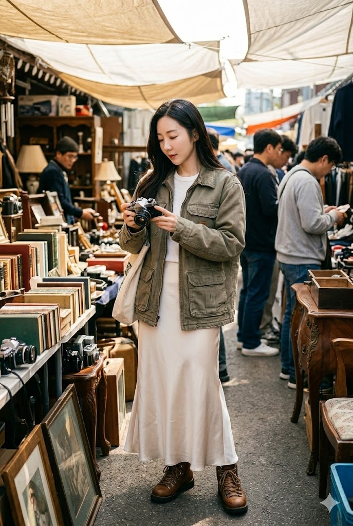 - 어울리는 장소: 주말의 플리마켓이나 오래된 헌책방 거리. 먼지 쌓인 책들 사이에서 보물을 찾을 때, 이 착장은 너를 가장 세련된 탐험가로 만들어줄 거야.