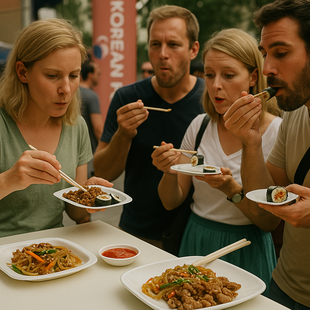 공연장 옆 부스에서는 김이 모락모락 피어올랐다. 고추장의 매콤한 향과 참기름의 고소한 냄새가 바람을 타고 퍼졌고, 김밥과 불고기, 잡채와 비빔밥이 작은 접시에 담겨 나왔다. 사람들은 조심스레 젓가락을 들었고, 입에 넣은 순간 미간을 찌푸리다가 이내 웃음을 지었다. 누군가는 ‘맵지만 계속 먹고 싶다’고 했고, 누군가는 그 자리에서 접시를 다시 들었다. 한식은 설명하지 않았고, 그저 맛으로 말했으며, 그 맛은 고요한 온기를 남기고 사람들의 입속을 지나갔다.