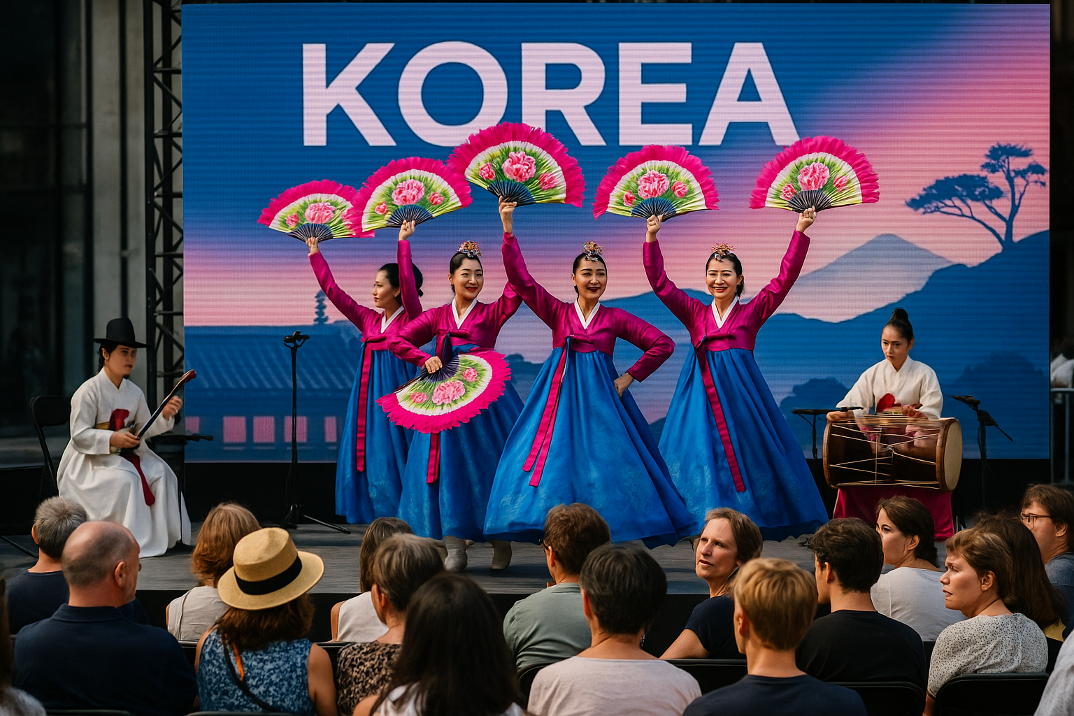 무대는 천천히 열렸고, 전통 의상을 입은 무용수들이 부채를 펼치며 회전했다. 가야금 소리가 공중을 가로질렀고, 부드러운 장단은 관객의 긴장을 하나씩 풀어내었다. 처음에는 낯설게 느껴졌던 손짓과 발놀림이 어느새 사람들의 숨결에 스며들었고, 박수는 조심스럽게 시작되어 곧 하나의 큰 호흡이 되었다. 그 무대는 누군가에겐 쇼였고, 누군가에겐 기억이 되었고, 누군가에겐 말 없는 인사로 남았다. 그날, 한국은 말이 아니라 몸짓으로 자신을 전했고, 사람들은 눈으로 그 언어를 받아들였다.
