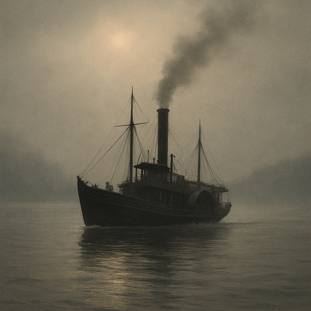 한 척의 목조 증기선이 물결을 꿰뚫고