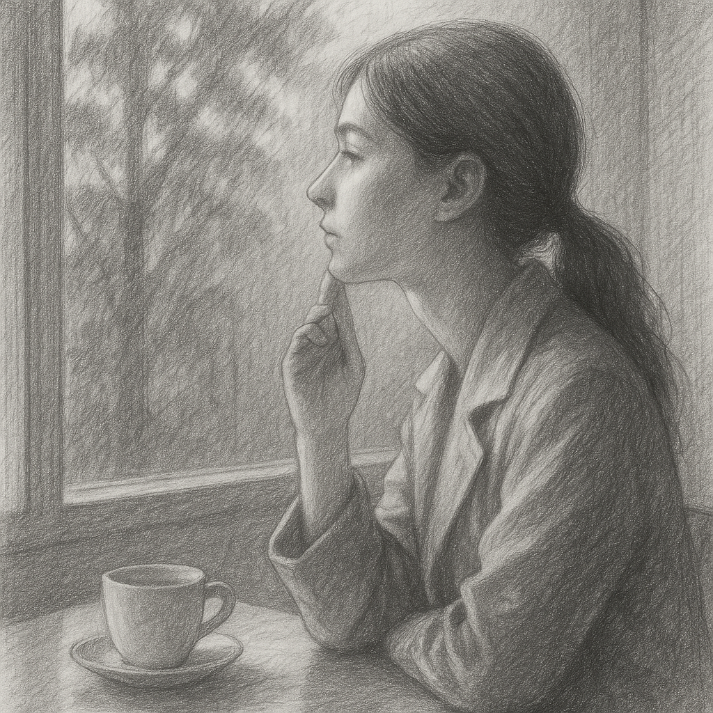 커피 잔 위, 진한 그림자가 그녀의 손끝을 감쌌다.