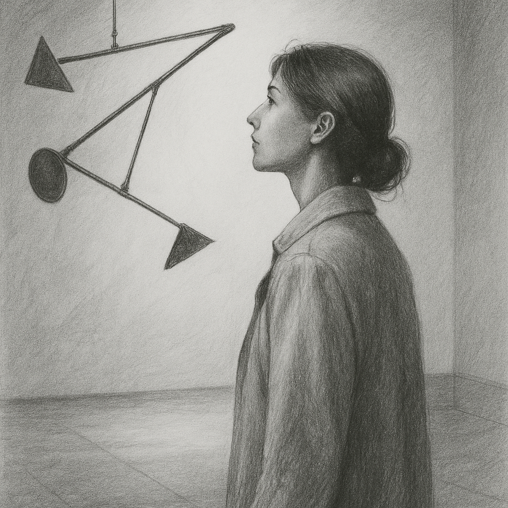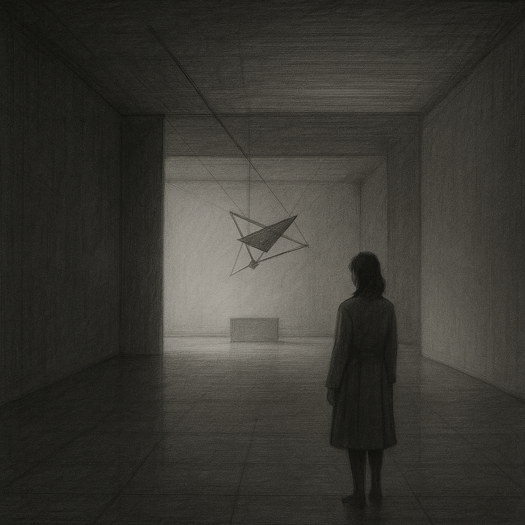 그녀가 가장 먼저 시선을 멈춘 곳은, 금속 구조물 세 개가 공중에서 위태롭게 서로를 지탱하고 있는 조형물이었다.