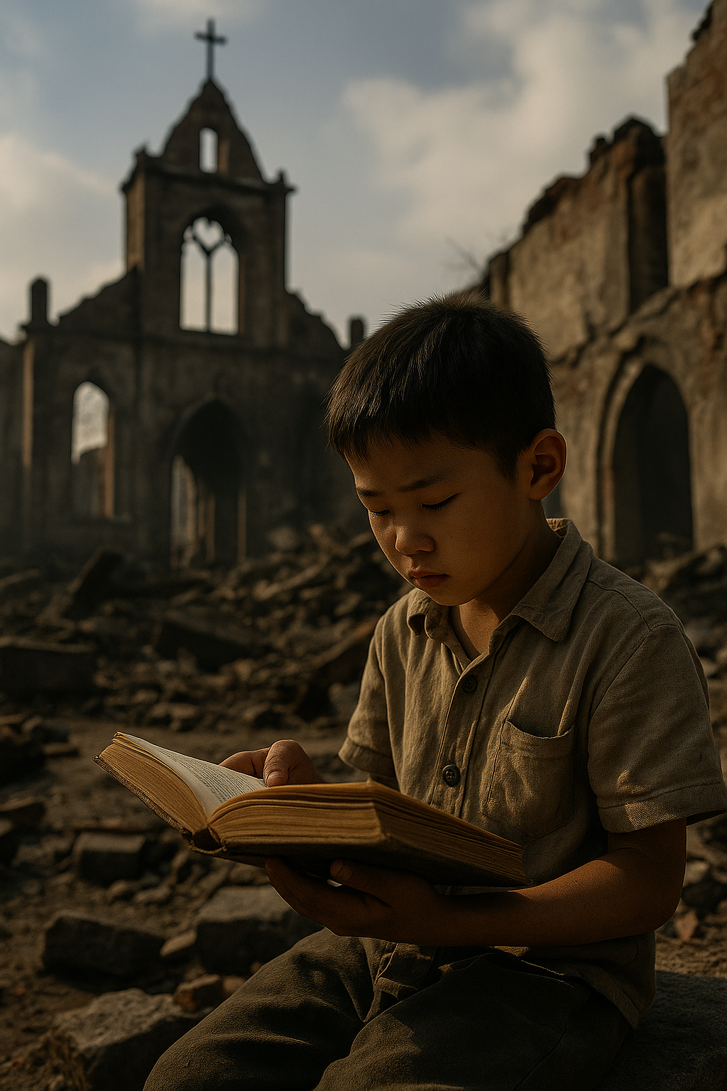망가진 교회 앞에 아이가 책을 읽고 있고,