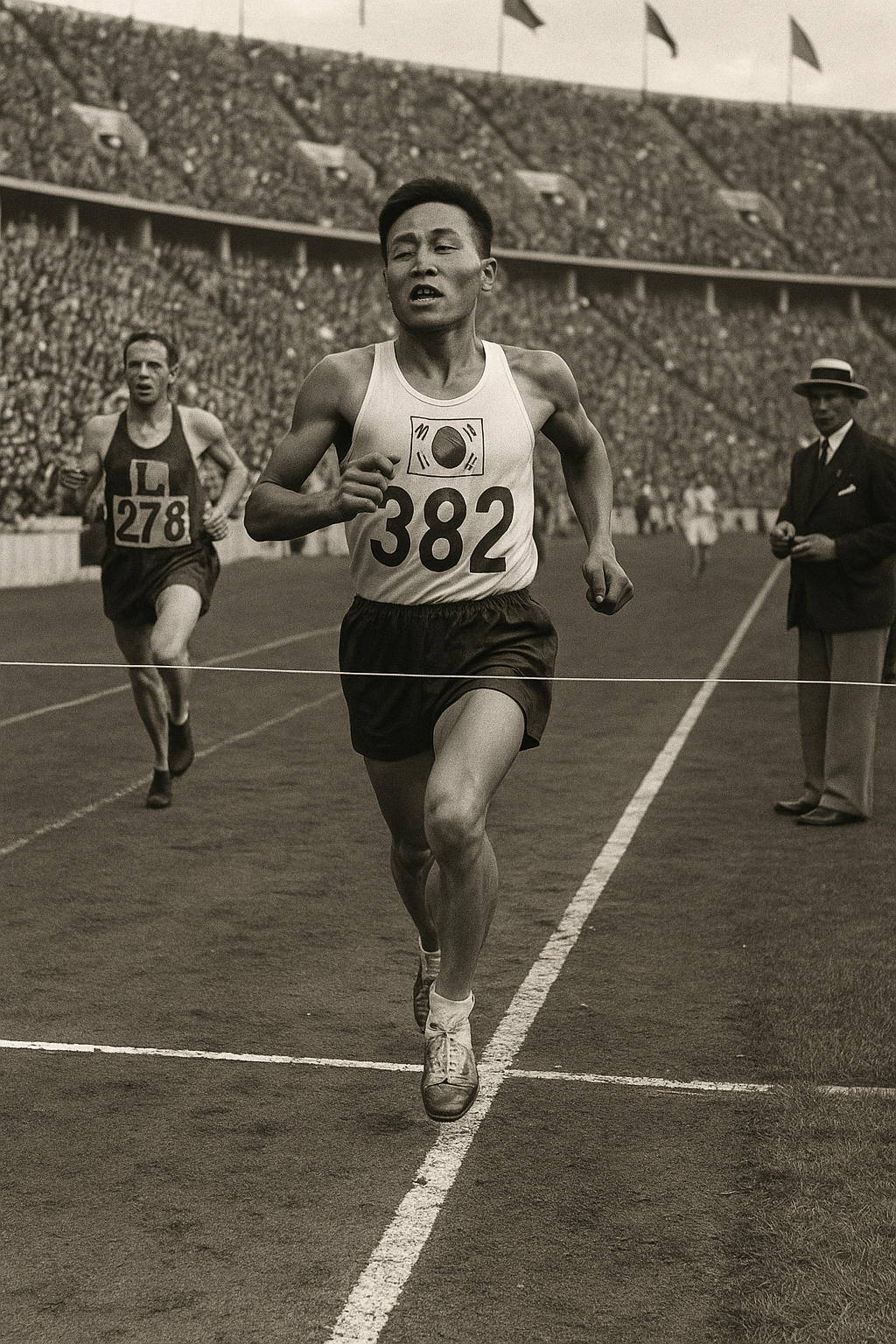 1936년 베를린, 가슴속 태극기를 품고 달린 손기정은 결승선을 넘어 한민족의 숨결과 꿈을 세계에 새겼다.