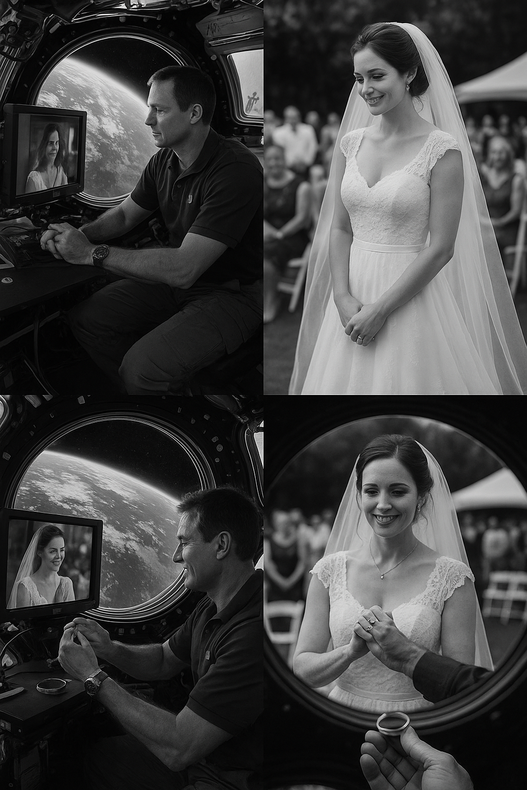 그들의 결혼식장은 하나였지만, 그날 두 사람은 서로 다른 세계에 서 있었다 — 하나는 무중력 속, 다른 하나는 푸른 행성 위.