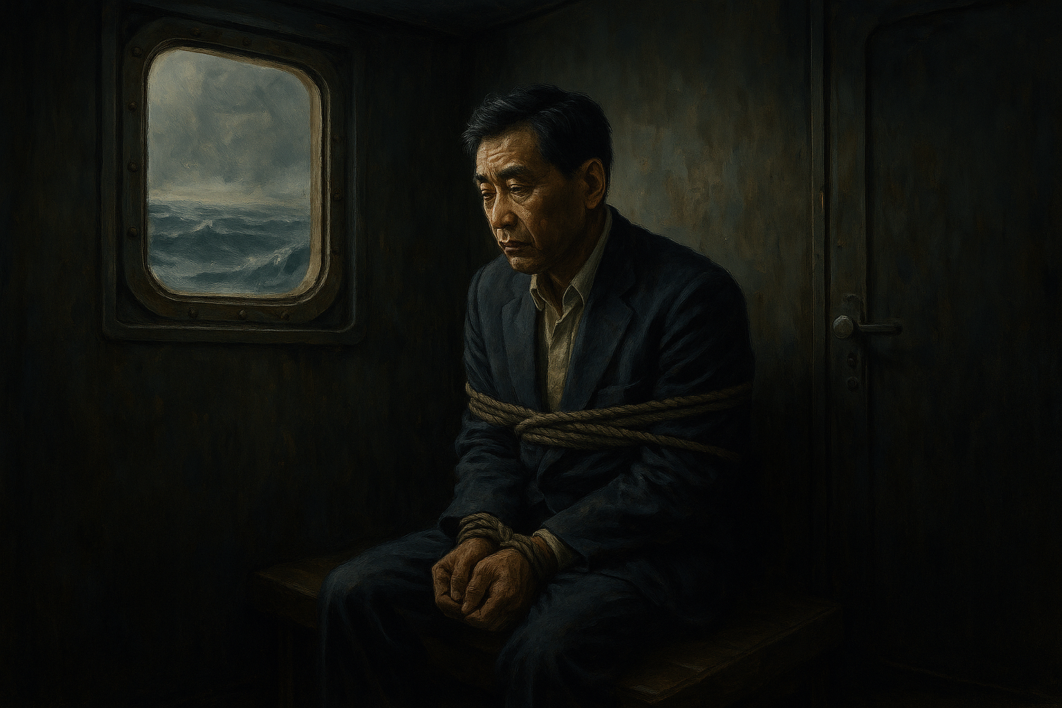 김대중은 배의 깊숙한 선실로 끌려갔다. 창문 없는 공간, 거친 파도 소리, 디젤 엔진의 진동이 온몸을 울렸다. 가끔 열리는 문틈 사이로, 그는 바깥의 수평선을 훔쳐봤다.