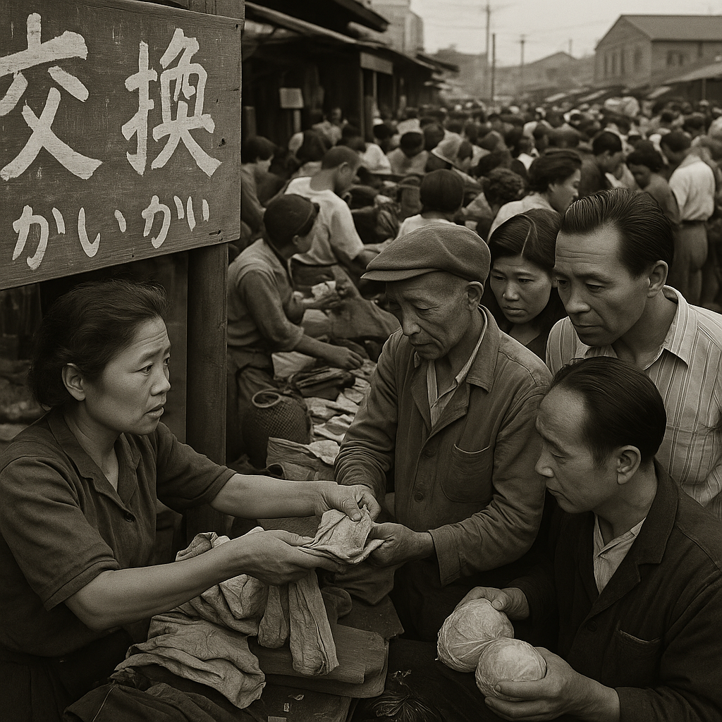 사람들은 폐허 속에서 금보다 귀한 쌀, 설탕, 담배를 구하기 위해 암시장으로 향했다.