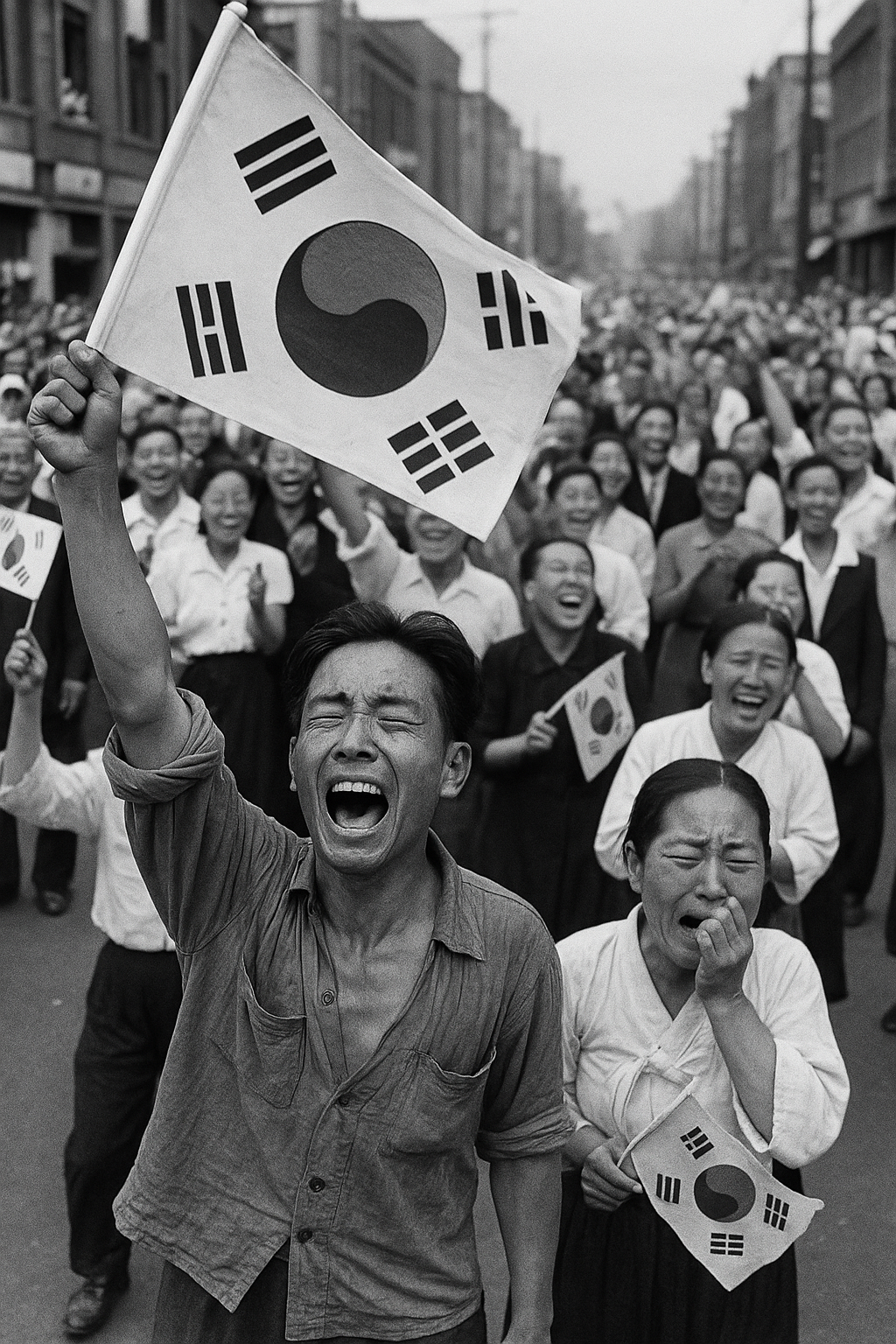 1945년 8월 15일, 라디오에서 일본 천황의 항복 선언이 흘러나오자 조선의 거리는 환호로 물들었다.