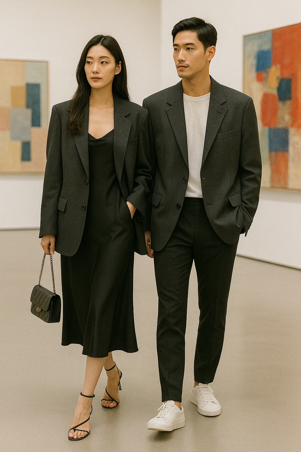 👉 포인트: 도회적이고 감각적인 분위기. 커플 룩처럼 맞춰 입어도 좋음.