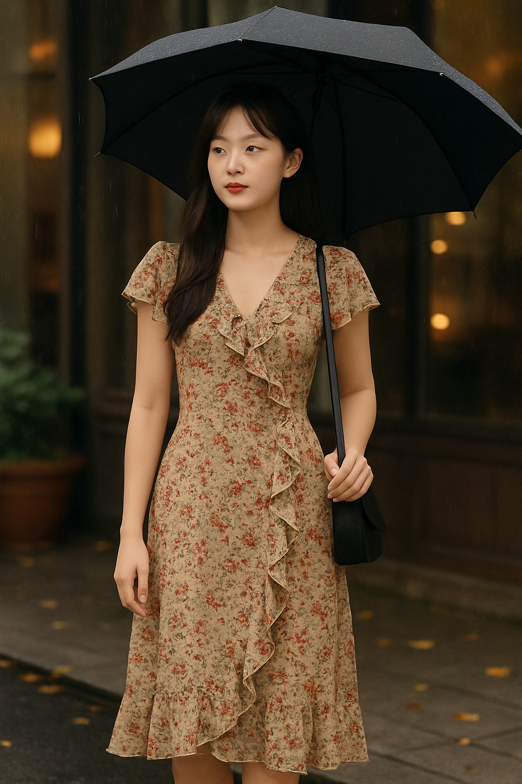 잔잔한 플로럴 패턴에 러플이 더해진 미디 드레스는 여성스럽고 화사한 선택이에요. 다만 패턴은 과하지 않게, 은은한 디자인이 좋아요.