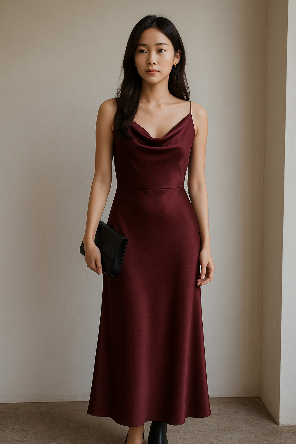 → 드레이프 라인이 고급스럽고, 깊은 와인 컬러가 가을 분위기와 잘 어울려요.