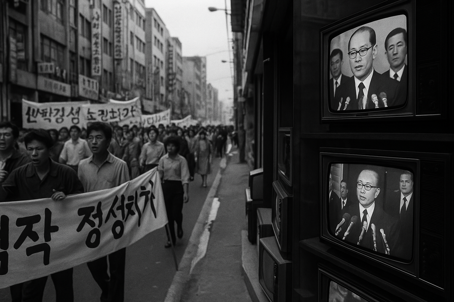 그날로부터 불과 몇 해 뒤, 한국 사회는 4·19 혁명과 5·16 군사정변이라는 급격한 정치 변동을 경험했다. 이 과정에서 라디오와 신문은 중요한 역할을 했지만, 텔레비전은 이제 막 걸음마 단계였다. 그러나 1980년대에 이르면 TV는 한국 정치의 풍경을 송두리째 바꾸는 매체가 된다. 전두환 정권이 3S 정책(스포츠·섹스·스크린)으로 대중을 달래려 했던 것도, 1987년 6월 항쟁의 장면이 생생히 카메라에 담겨 전파를 탄 것도 모두 매체 권력의 힘이었다. 케네디–닉슨 토론이 보여준 “이미지 정치”는 20여 년의 시차를 두고 한국에도 그대로 재현되었다. 카메라 앞에서 미소를 지을 수 있느냐, 목소리를 어떻게 울릴 수 있느냐가 지도자의 자질 평가와 직결되었던 것이다.