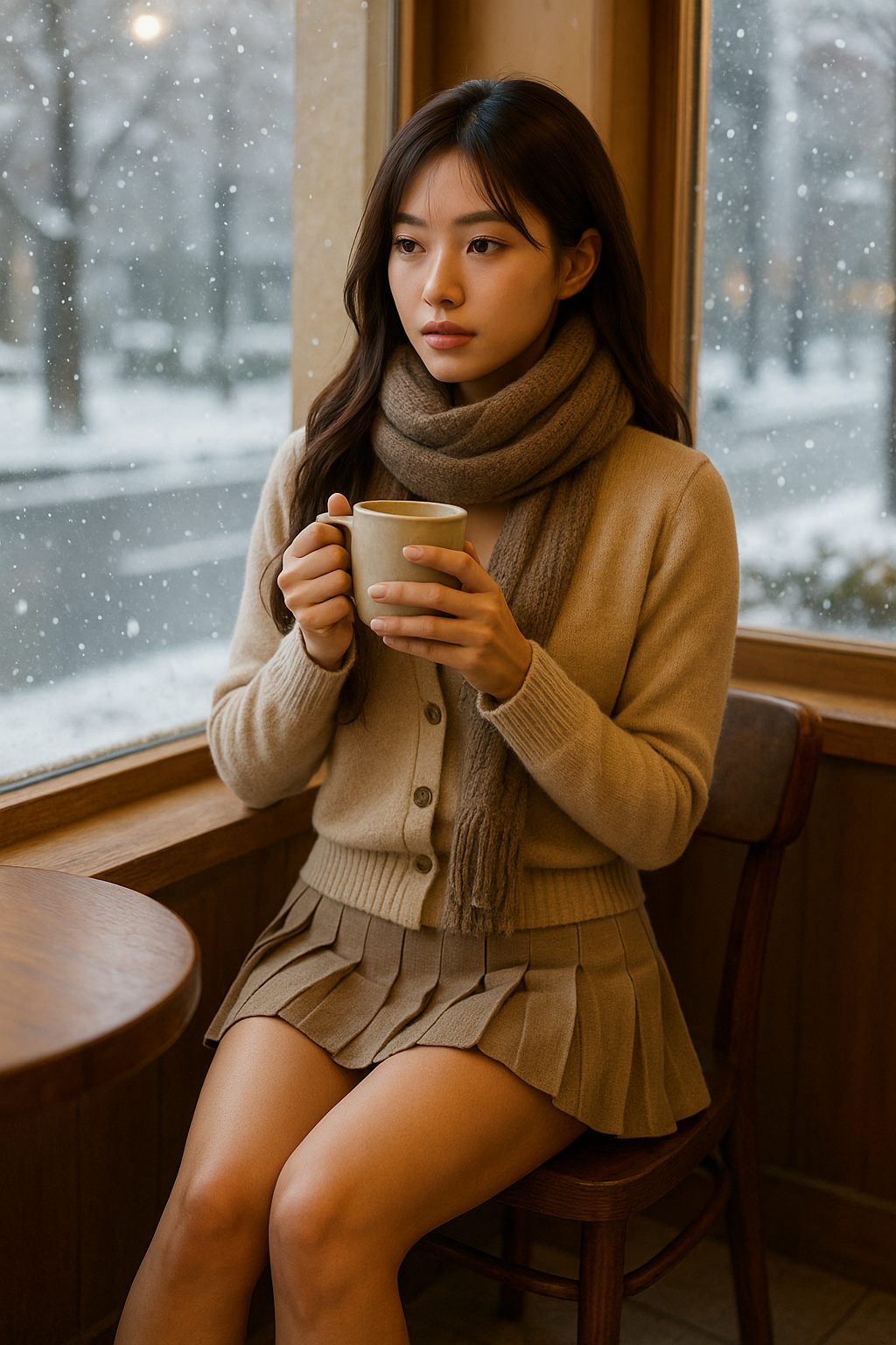 베이지 가디건과 플리츠 스커트,