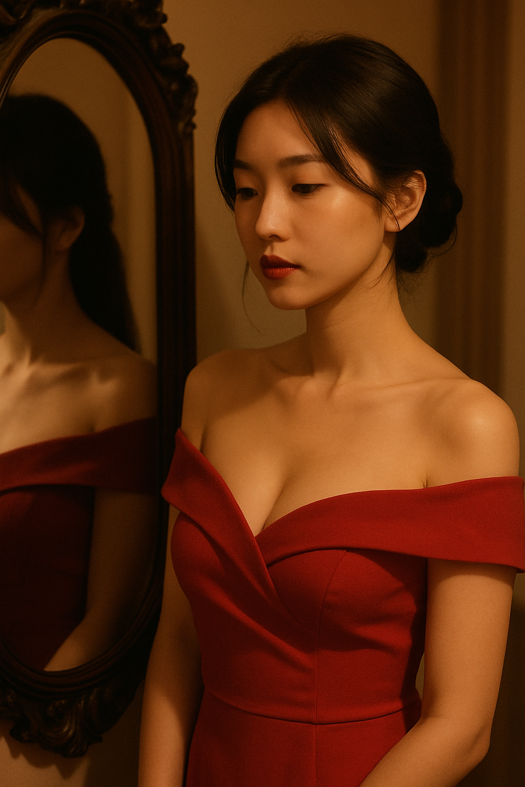 거울 앞, 붉은 천이 천천히 어깨 위로 흘러내린다.