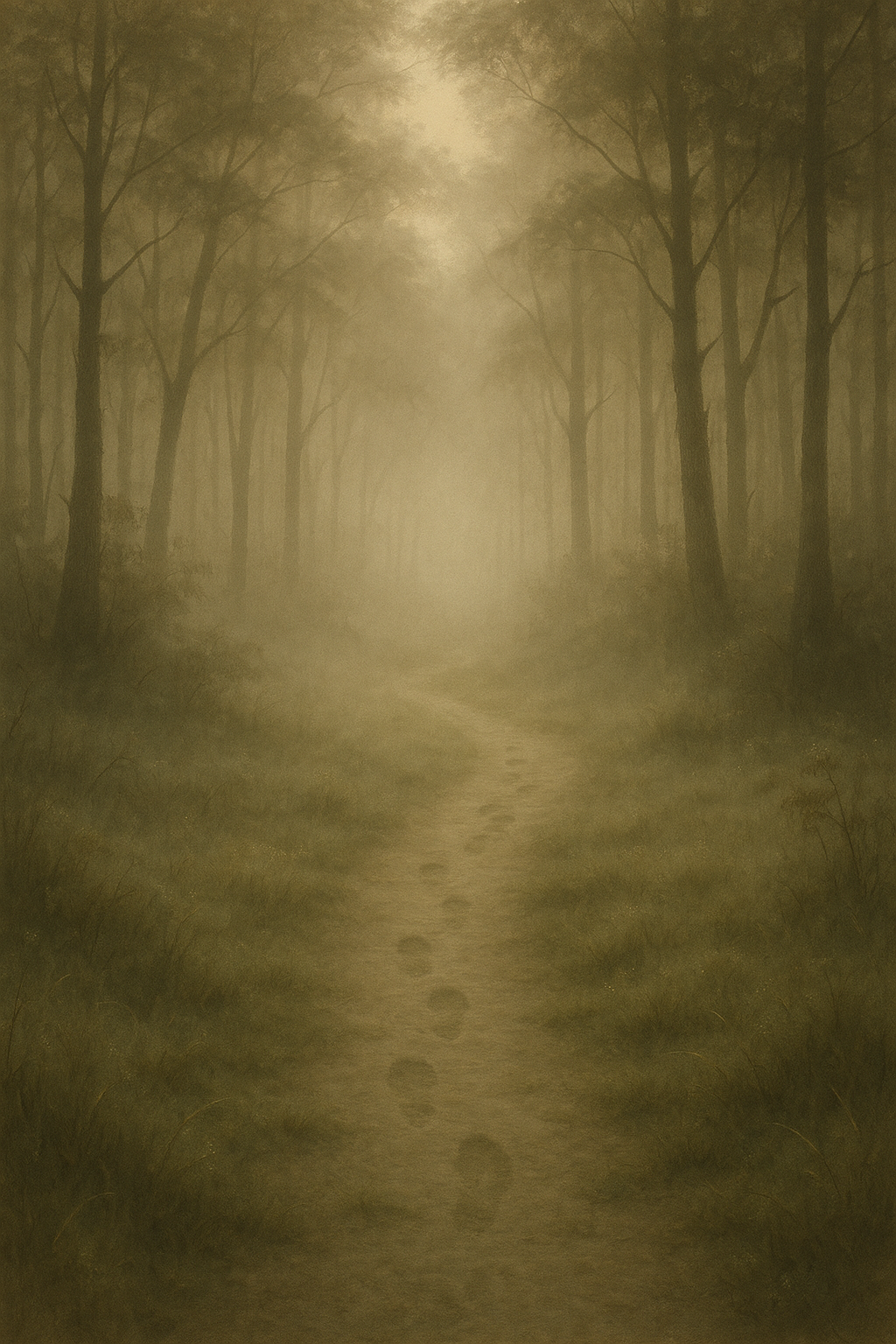 > A soft misty path through a forest at dawn, faint footprints fading into the dew-covered ground, symbolizing unseen virtue and the quiet beauty of trace-less action — inspired by Laozi’s Dao De Jing, no text.