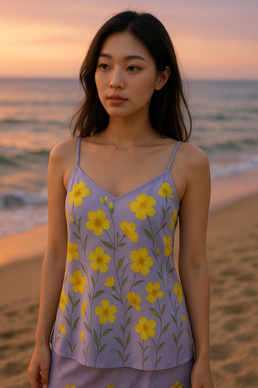 #달맞이꽃나시 #해질녘룩 #여름밤패션 #바다옆패턴 #실크나시 #조용한빛 #야생화처럼입는옷