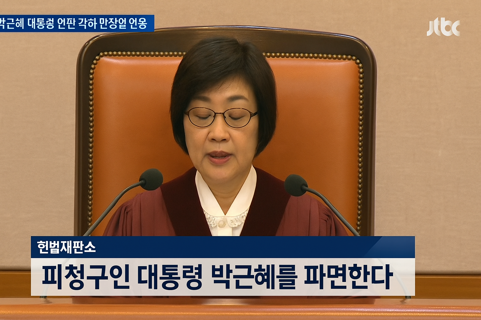 ‘헌법 수호의 의무를 위배했다’며 탄핵을 인용했다.