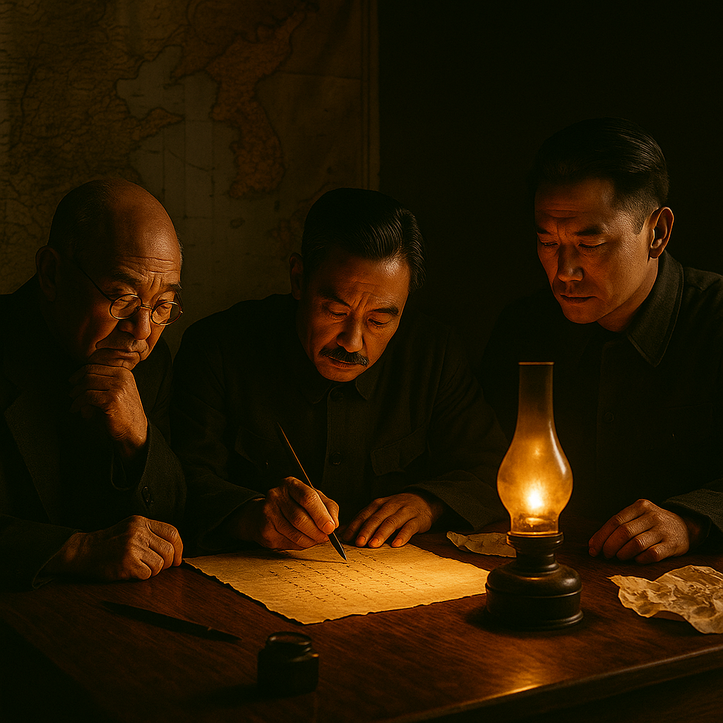 세 사람은 총 대신 펜을 들고, 불 꺼진 방 안에서 오랜 밤을 지새웠다.