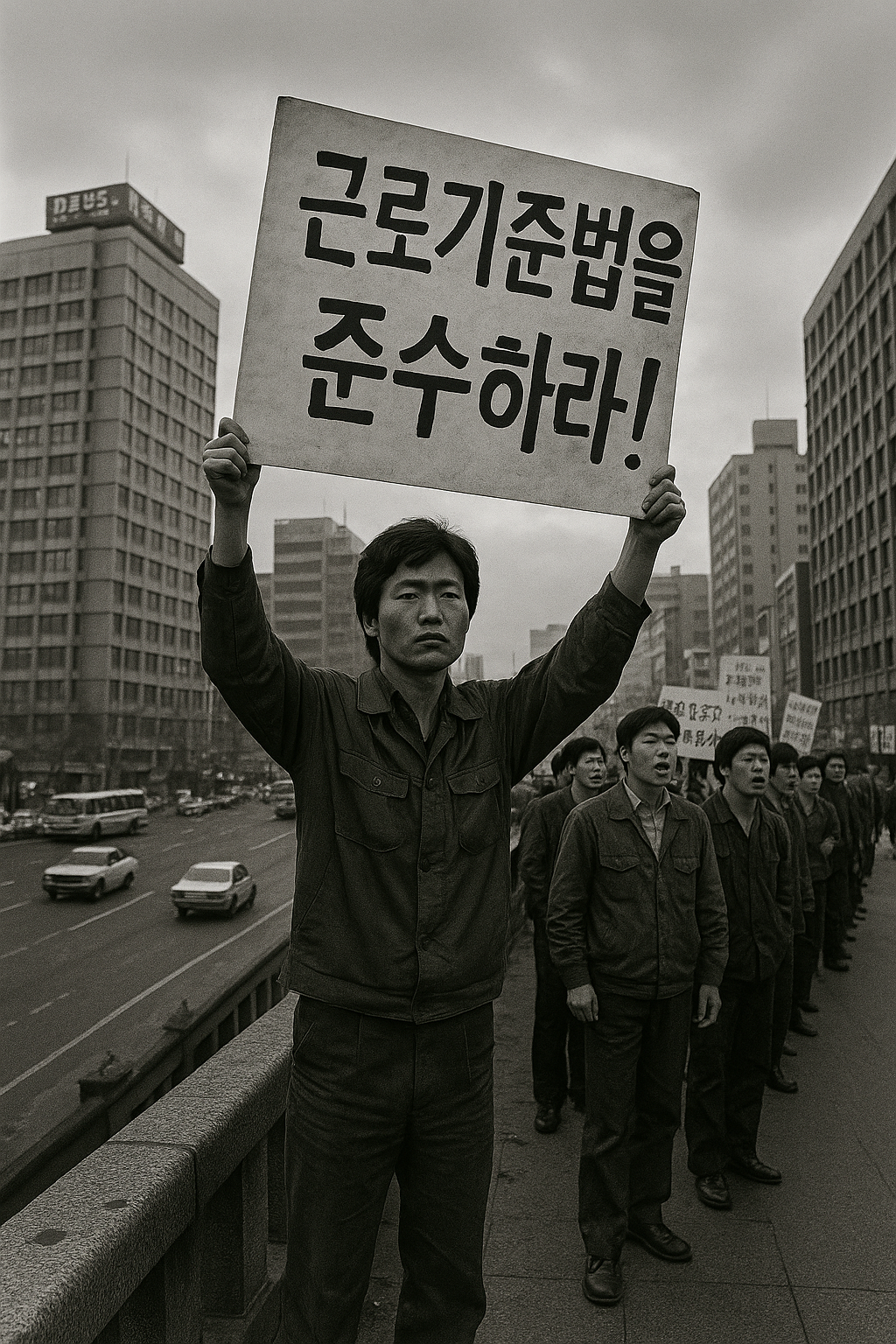 1970년 당시 서울 청계천 일대의 봉제공장은 ‘하루 열여섯 시간 노동’이 당연한 곳이었다. 노동자 대부분은 10대 소녀였고, 책걸상도 없는 작업실에서 무릎 위에 원단을 올려놓고 바느질을 해야 했다. 환기는 제대로 되지 않았고, 조명은 어둡고, 먼지는 폐 속으로 그대로 들어갔다. 임금은 하루 100원도 되지 않는 경우가 많았다.