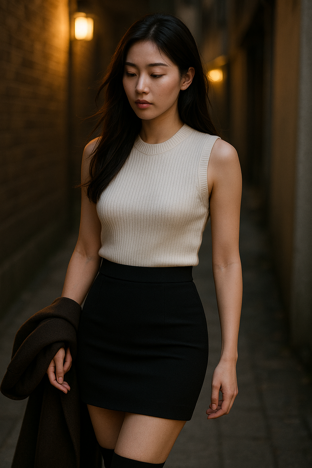 ③ 니트 베스트 단독 × 하이웨스트 스커트 — 감추는 방식으로 드러내는 관능