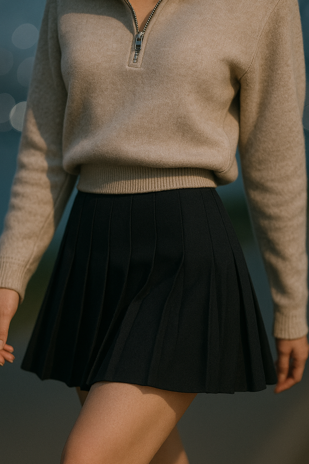 ② 하프집업 플리스 × 플리츠 스커트 — 겨울 스포츠 감성과 단정함의 조우