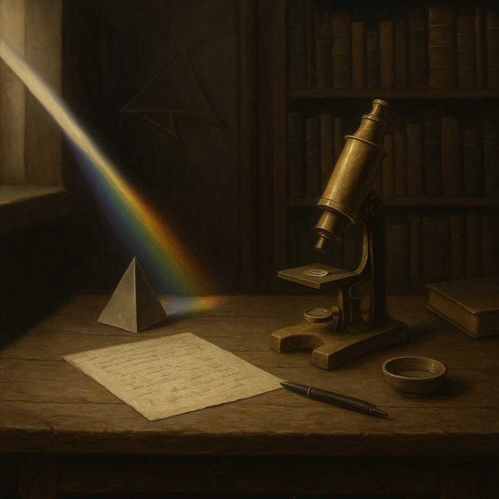 이 새로운 무대 위에 가장 먼저 올라온 얼굴들 가운데 하나가 아이작 뉴턴이다. 1672년, 뉴턴은 프리즘 실험을 바탕으로 “백색광은 여러 색이 섞인 것”이라는 주장을 담은 논문을 Philosophical Transactions에 발표한다. 그는 빛이 단순히 프리즘을 통과하면서 색으로 ‘변하는’ 것이 아니라, 애초에 서로 굴절률이 다른 여러 색의 광선으로 이루어져 있다고 주장한다. 이 논문은 광학 이론을 바꾸었을 뿐 아니라, 실험적 증거와 수학적 정교함, 그리고 다소 공격적인 논쟁 방식까지 결합하여, 오늘 우리가 익숙하게 여기는 “과학 논문”의 한 전형을 만들어 냈다.