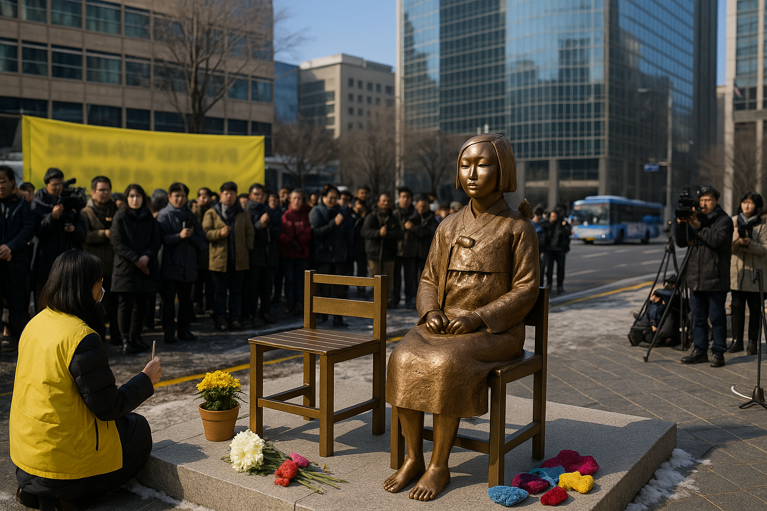 그날 정오, 일본대사관 앞 길 위에는 평소보다 훨씬 많은 시민과 학생, 종교인, 해외 연대 단체 활동가들이 모였다. 추운 겨울, 영하 가까운 날씨였지만 인도는 발 디딜 틈 없이 빽빽했다.