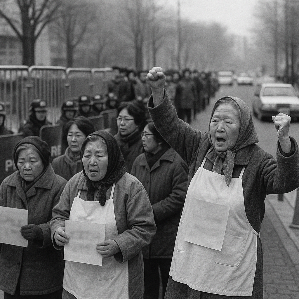 1992년 1월 8일, 서울 종로구 일본대사관 앞 인도에 몇 명의 노년 여성들이 섰다.